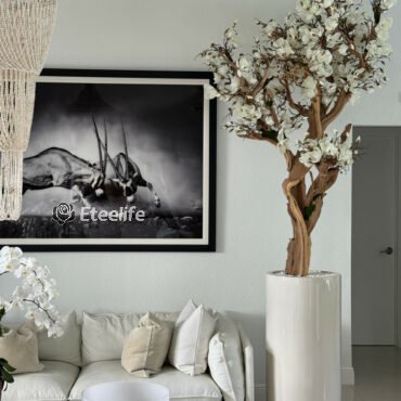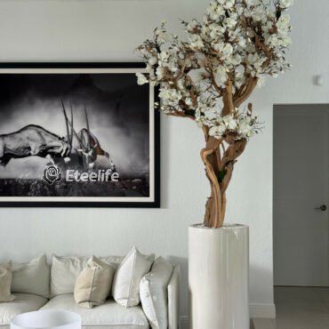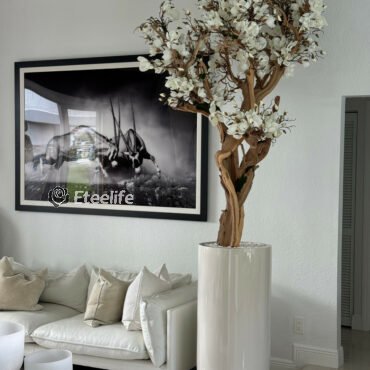 Enjoy beautiful, lifelike magnolia tree that won’t lose its flowers after spring awakens. Each tree is a one of a kind. Flowers are placed by hand by our skilled artisans onto large wood trunks of California mountain wood.