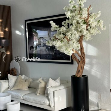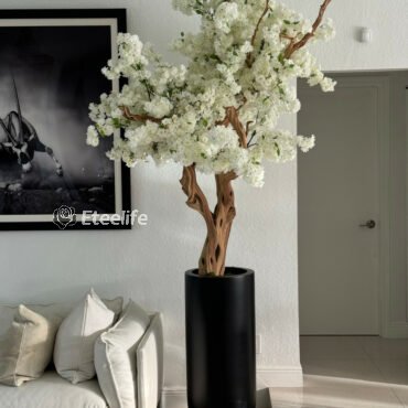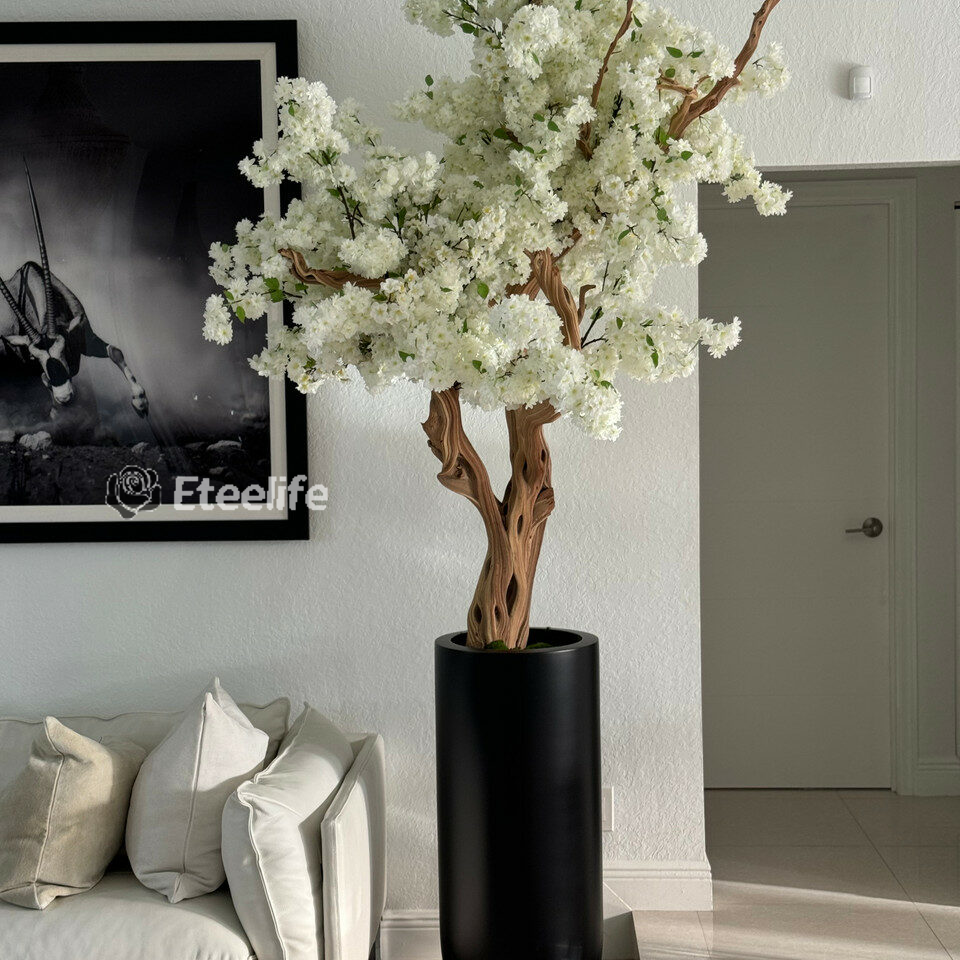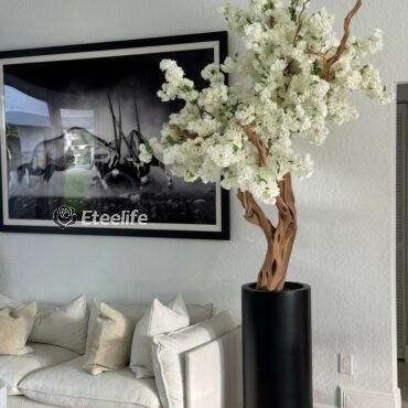 Cherry blossoms are a symbolic flower of the spring, a time of renewal, and the fleeting nature of life. Anchored in our St. Tropez matte black planter, this chic design adds a modern twist to any decor. The sleek planter easily compliment any space around the home or office. Its size and shape provide a perfect canvas for a our large white cherry blossom tree. Each tree is a one of a kind, flowers are placed by hand by our skilled artisans onto large wood trunks of California mountain wood. This bouquet of lush elegant white cherry adds a fresh and stylish touch to any room.
